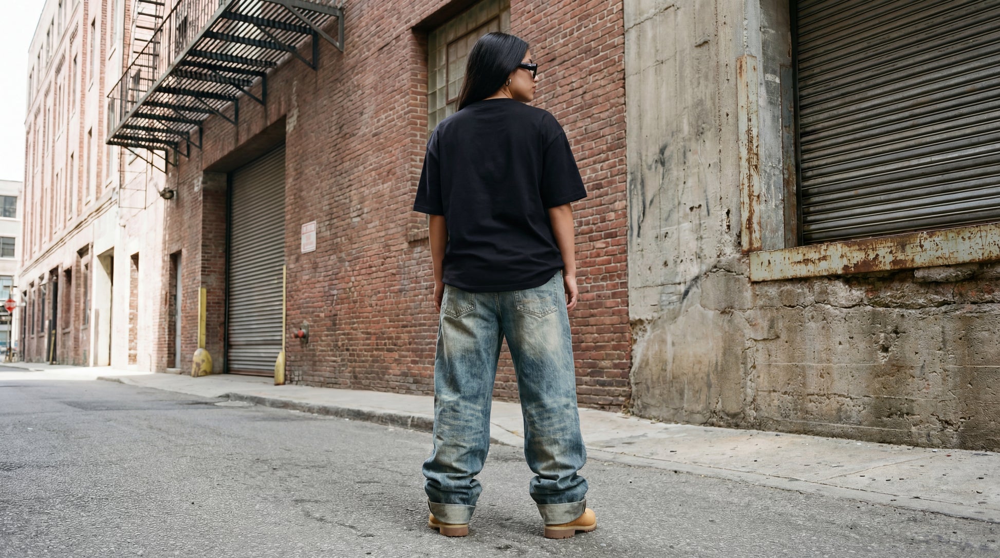 Tejido Japonés tipo "Slub" de 14.5 oz: Seleccionamos un gramaje pesado con textura irregular (slubby texture). Esta irregularidad en el hilo captura el tinte de forma desigual, creando una profundidad de color rica y granulada que las telas lisas industriales no pueden replicar.